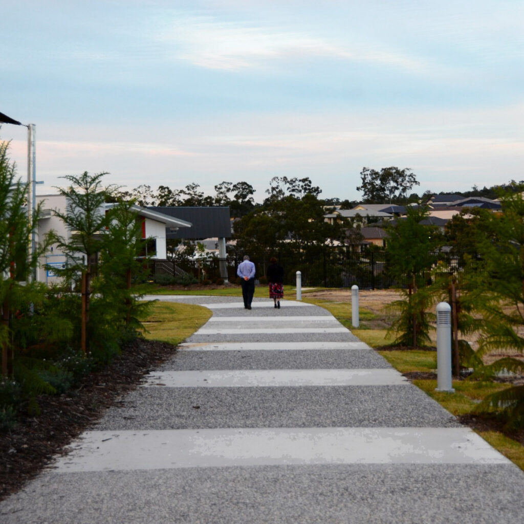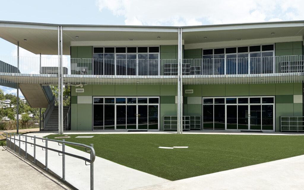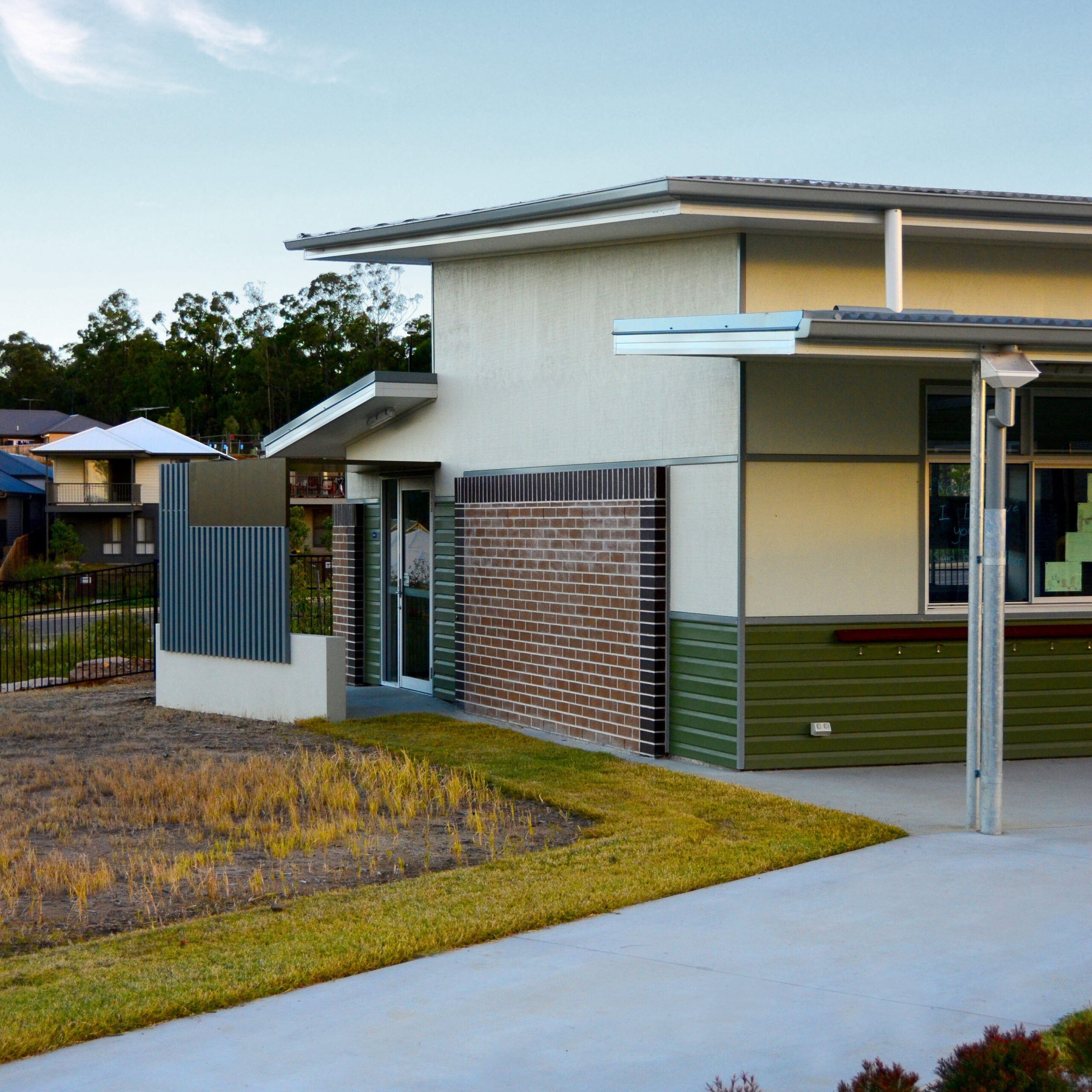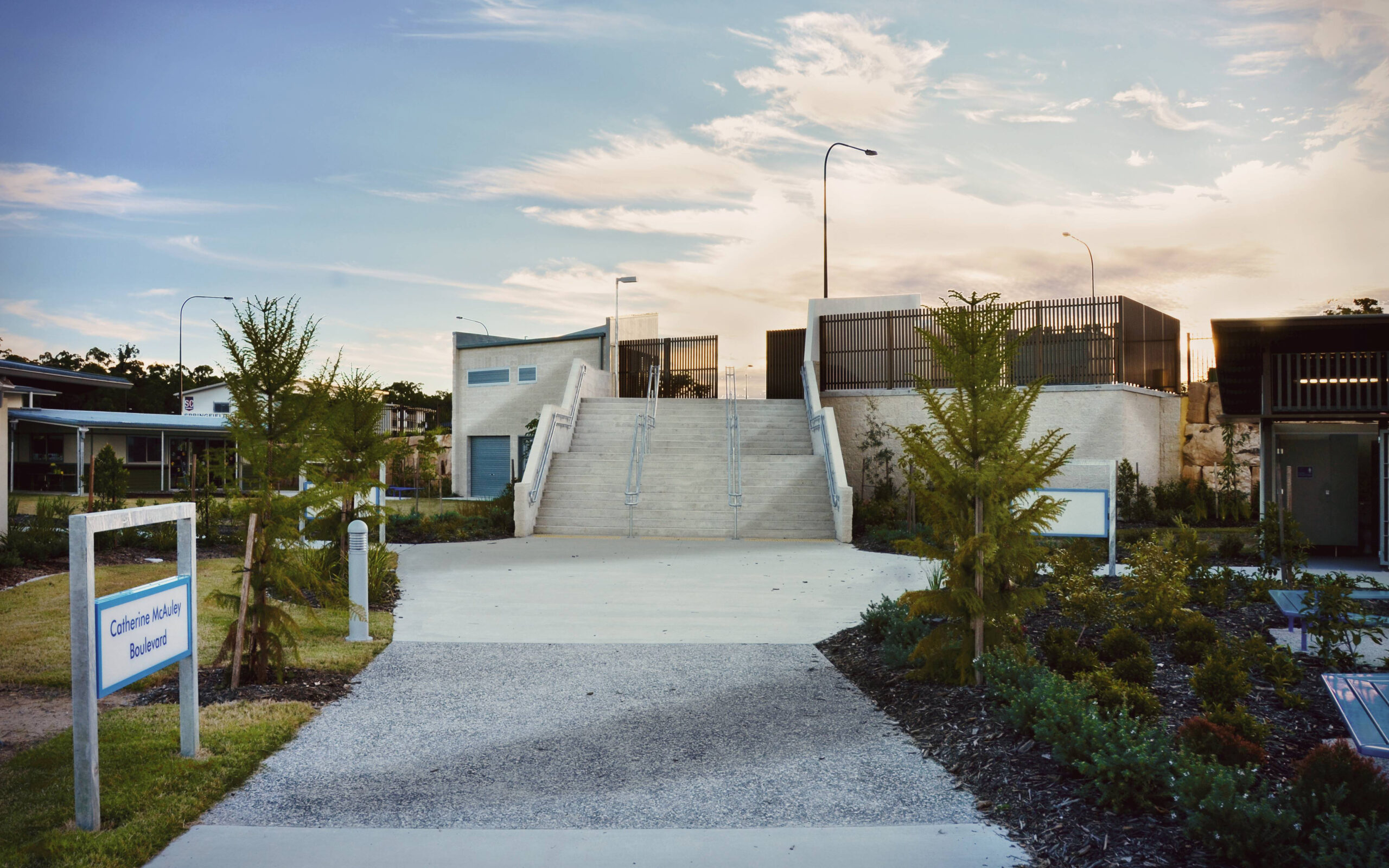 The design for the proposed Catholic P-6 Primary School, Out of School Hours Care facility, and Long Day Care Centre at Springfield responds to the requirement of configuring school and community uses on a site, acknowledging the sites attributes and relationship to the surrounding neighbourhood. On a steeply sloped site, the masterplan was developed as a two tier arrangement for building platforms and playing fields. This design minimises the gradient change between buildings and provides an easily accessible layout for students and staff. The precinct environment, as developed in the masterplan for years P-2 and Years 3-6, is reinforced with the design of an internal square providing an address to the church and administration building. Both precincts share carparking and sports field facilities and gain access to common areas such as administration and covered areas by all student groups. This is achieved with an internal hub formed by the resource centre, administration centre and out of school hours care.